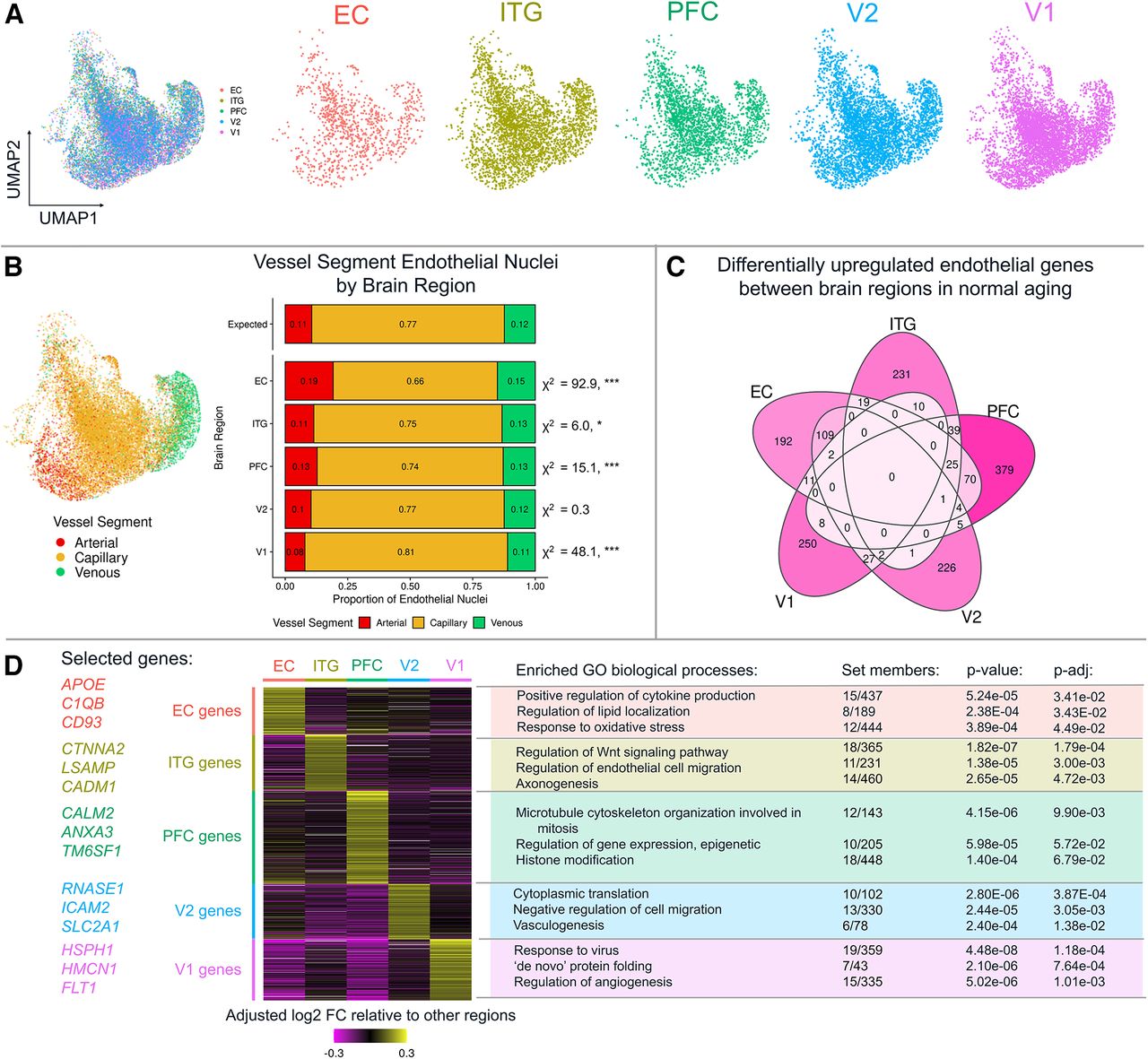 After identifying nuclei corresponding to endothelial cells, we focused on inter-regional differences across the five brain areas included in this experiment. Interestingly, the dimensionality reduction approach UMAP (uniform manifold approximation projection) largely separated nuclei based on vascular segment type (artery, capillary, or vein) rather than based on cortical region, as shown in Figure 5A-B below. Even so, we found hundreds of region-specific endothelial genes within the healthy donors, mapping to a set of distinctive biological pathways that include cytokine production (entorhinal cortex, EC), endothelial cell migration (inferior temporal gyrus, ITG), vasculogenesis (secondary visual cortex, V2) and ‘de novo’ protein folding (primary visual cortex, V1).