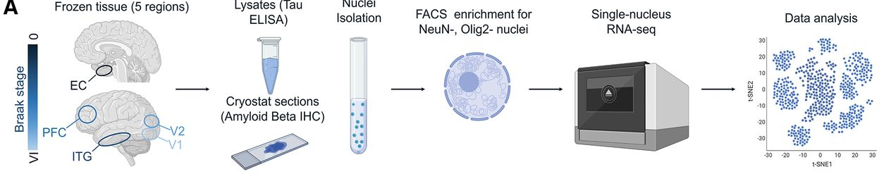 This was an important first step in demonstrating the tau-associated transcriptomic alterations to the human cortical vasculature. However, we know that endothelial cells differ in their molecular profiles and functions not only across organs, but also across regions within the cerebral cortex in both health and diseaes. It’s really important to understand how endothelial cells differ across the brain, because AD neuropathology affects brain regions differently; for example, medial temporal regions are most susceptible to early tau pathology, while areas like the primary visual cortex seem robust to pathology until very late stages of disease progression (Braak and Braak, 1991; Braak et al., 2006).