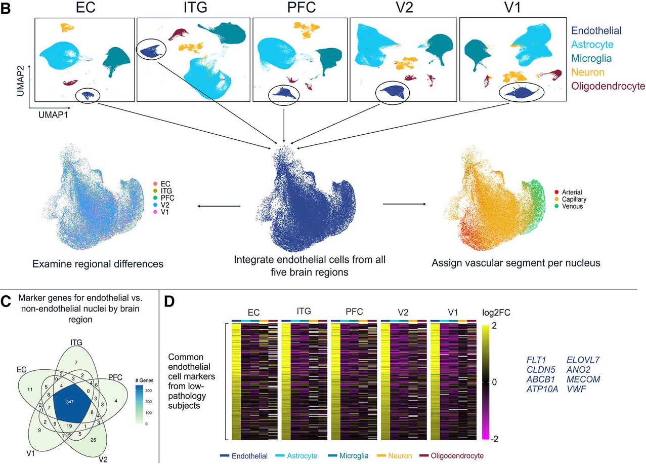 Considering that cortical brain areas are differently affected by amyloid β and tau pathologies, and that vascular changes are intimately related to AD, the goals of this work were twofold: (1) to characterize baseline heterogeneity in the endothelial cell transcriptome in the normal aged brain; and (2) to elucidate how regional differences in disease progression impact endothelial cell gene expression in AD. We performed single-nucleus RNA sequencing (RNAseq) on tissue from 32 human donors () with five brain regions in total, listed in order of highest to lowest tau pathology burden: entorhinal cortex, inferior temporal gyrus, prefrontal cortex, visual association cortex, and primary visual cortex.