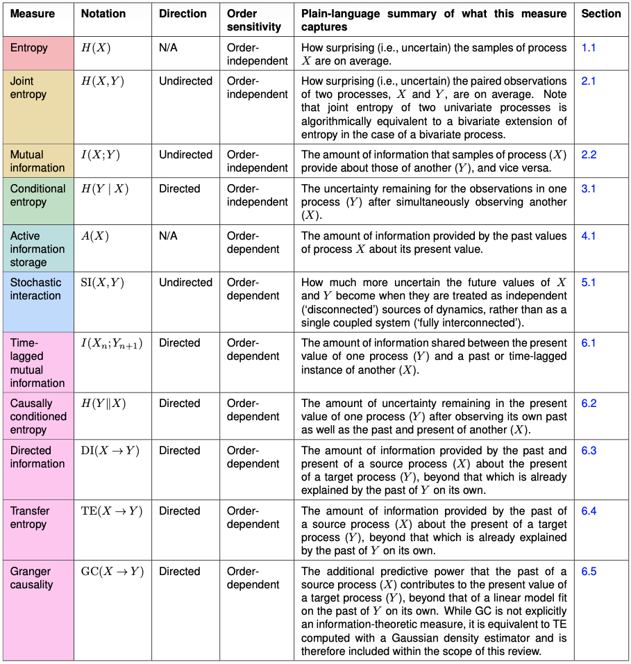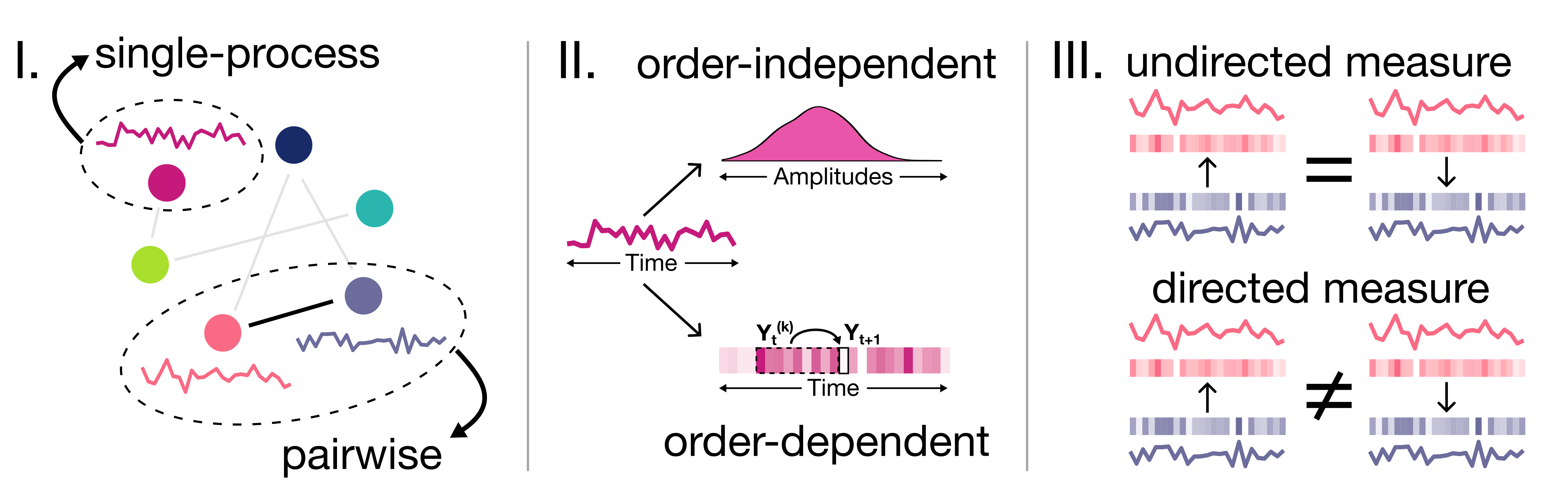 Three key characteristics distinguish the information-theoretic time-series measures covered here